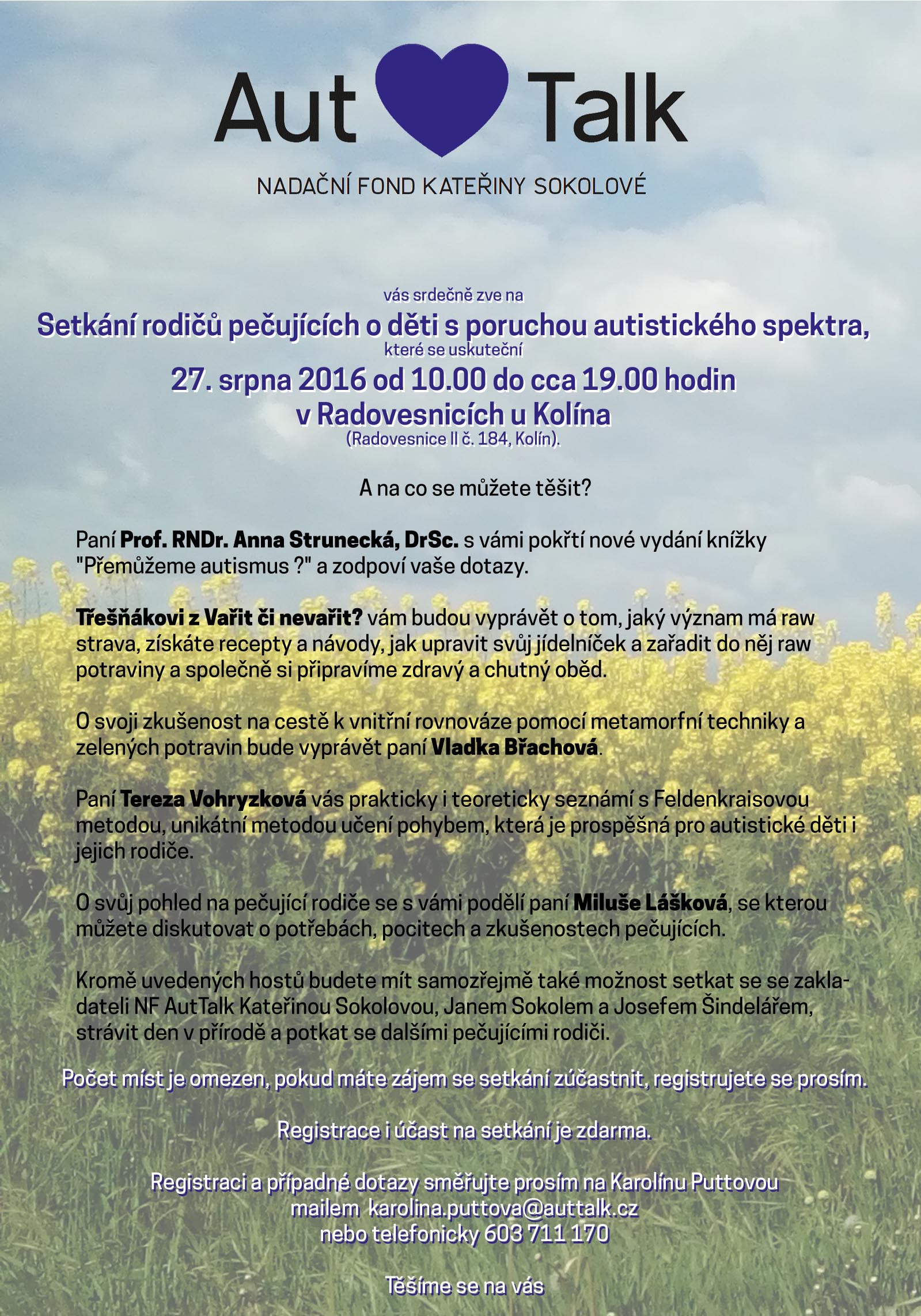 V sobotu 27. srpna 2016 se v Radovesnicích u Kolína uskutečnilo setkání rodin s dětmi s poruchou autistického spektra. Program byl pestrý. Paní profesorka Strunecká slavnostně pokřtila přepracované vydání knížky Přemůžeme autismus? II, všichni měli možnost se zeptat na cokoliv o raw stravě a hlavně ochutnat, proběhla přednáška o zdravých potravinách i Feldenkraisově metodě. A hlavně, rodiče se snad alespoň na chvíli zastavili, poslouchali a povídali si. Pro nás to byl výjimečný den a už teď se těšíme na další. Akce se uskutečnila díky podpoře