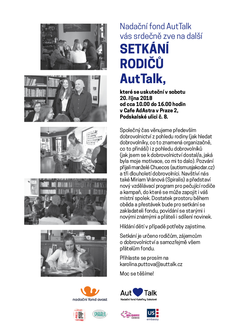 Už tradičně se sejdeme v půvabné kavárně Cafe AdAstra, tentokrát v sobotu 20. října 2018. Pozvání přijali Barbora a Ernosto Chuecos a tři lidé, kteří už delší dobu navštěvují jejich syna Angela jako dobrovolníci a řeč bude o tom, jaké to je otevřít svůj domova cizím lidem, co všechno to člověku přinese a s čím se zase musí rozloučit. Těšíme se také na novinky, které za společnsot Spiralis přijde sdělit Miriam Vránová, a hlavně se těšíme na vás :-)